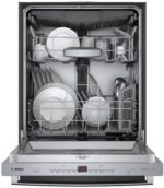 - Hidden integrated electronic controls maintain a clean exterior and InfoLight shines a red beam on the floor to indicate when the dishwasher is running