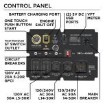 • (2) 5-20R household duplex outlets, (1) L5-30R, (1) Transfer Switch Ready L14-30R 120/240-Volt twist-lock, (1) 120/240V 14-50R, and (2) USB ports with rubber outlet covers