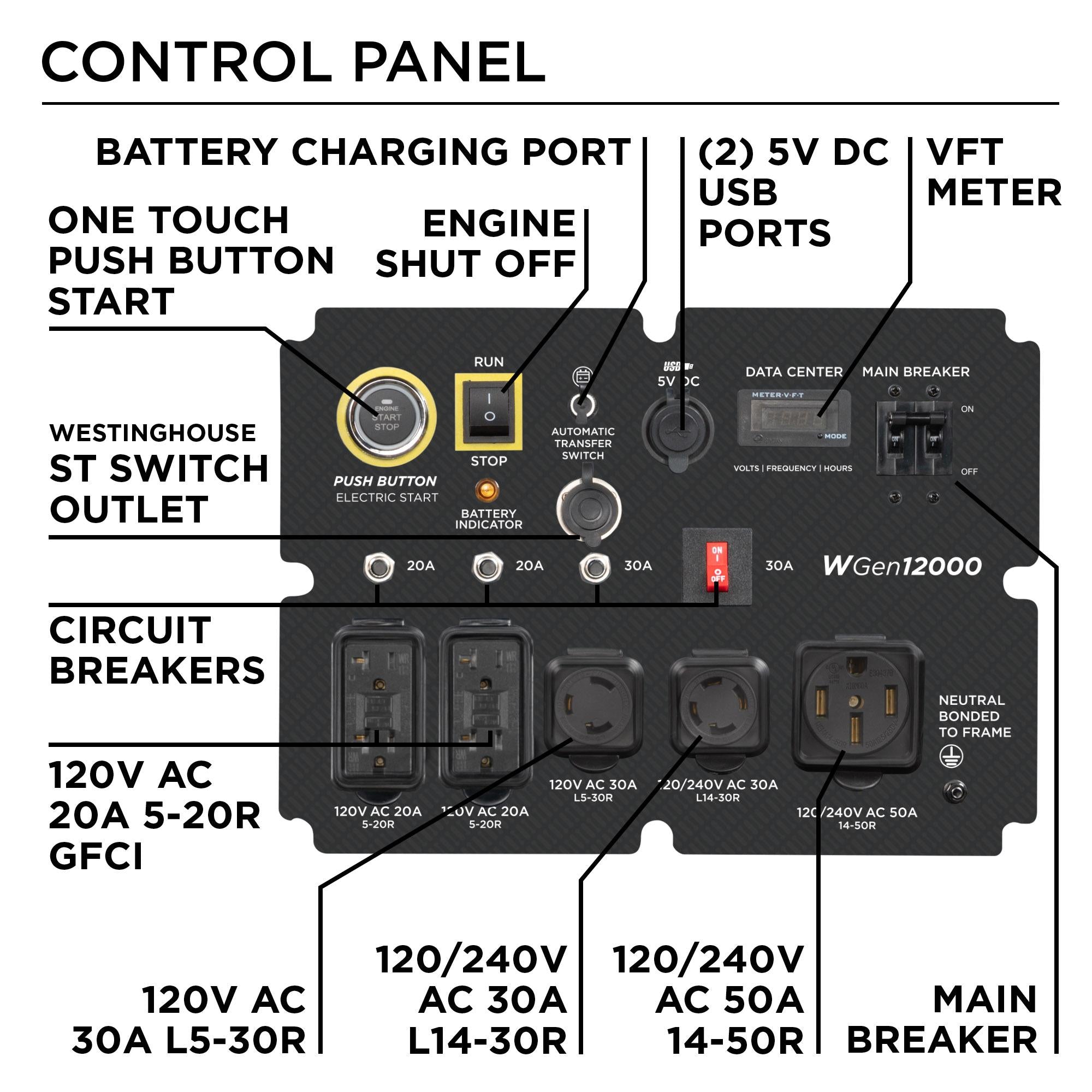 For your toughest power needs, the Westinghouse WGen12000 Portable Generator is an ultra duty generator engineered for strength. With 15,000 peak watts and 12,000 running watts, the WGen12000 is built with a brawny 713cc V-Twin OHV Westinghouse Engine to yield up to 11 hours of run time on a hefty 10.5 gallon (40 L) gas tank with a built-in fuel gauge. It features Push-Button Electric Start to make starting the WGen12000 effortless while the remote start key fob offers added ease from a distance. Transfer Switch Ready L14-30R and larger 14-50R outlets have the muscle to power all your major appliances like your air conditioner, refrigerator, and sump pump as well as lights or entertainment centers at the same time with a single cord hookup. It’s easy to charge sensitive electronics because the WGen12000 produces less than 5%THD, allowing you to plug straight into its intuitive control panel. VFT Data Center displays real-time performance information to keep you up to date with regular maintenance. Constructed with a rugged steel frame with lift brackets, the WGen12000 is conveniently portable with an included set of heavy-duty never-flat wheels and handles to have your house, travel trailer, or job site powered in seconds. The WGen12000 is complete with a 3-Year Limited Warranty and Lifetime Technical Support backed by our nationwide customer service and support network.